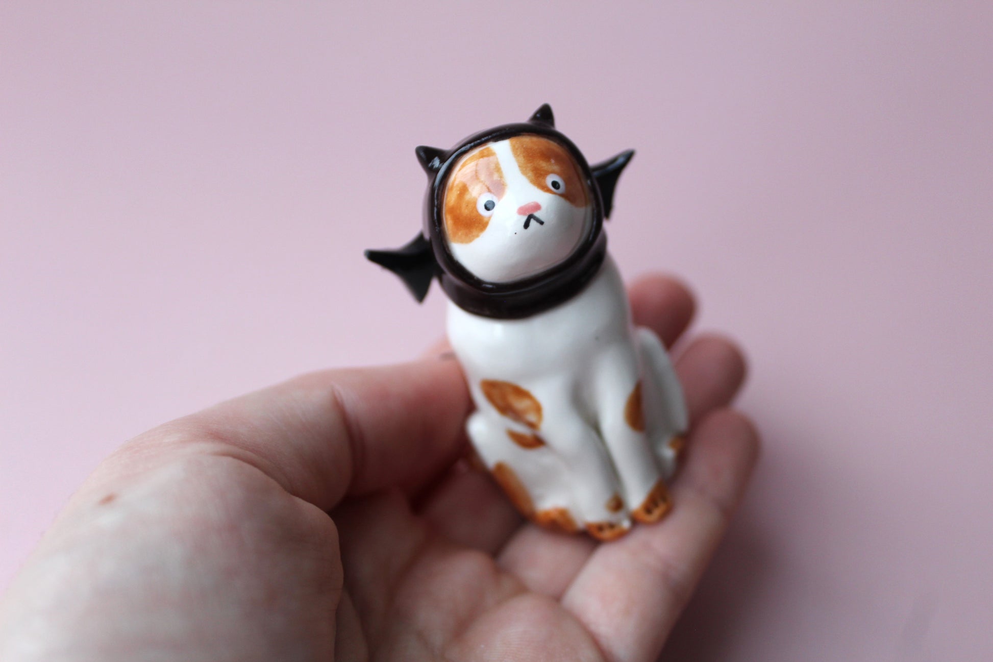 A spotted ginger cat with a bat costume on! Ready for halloween.