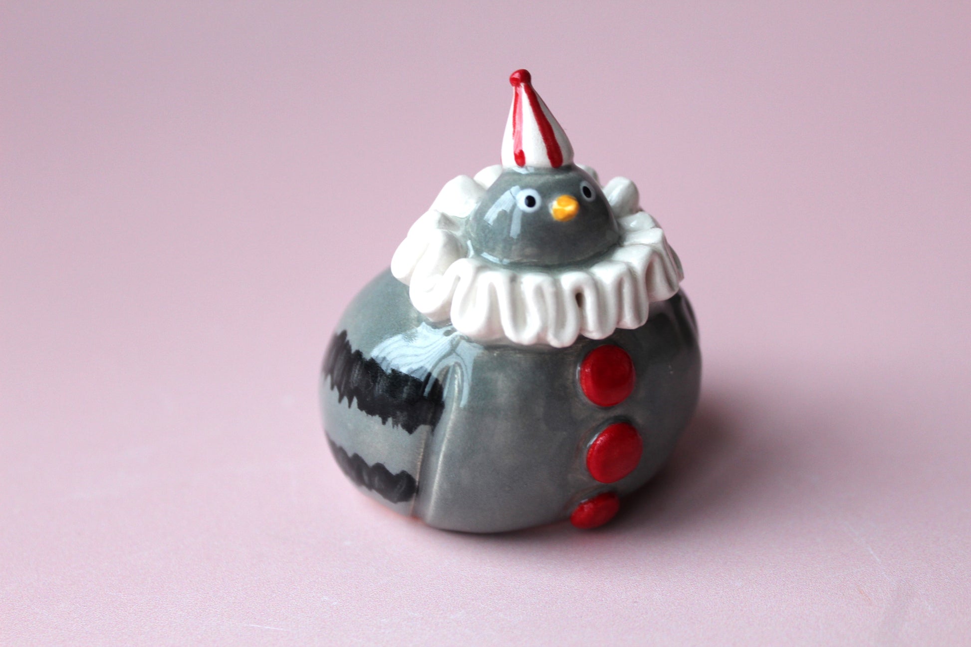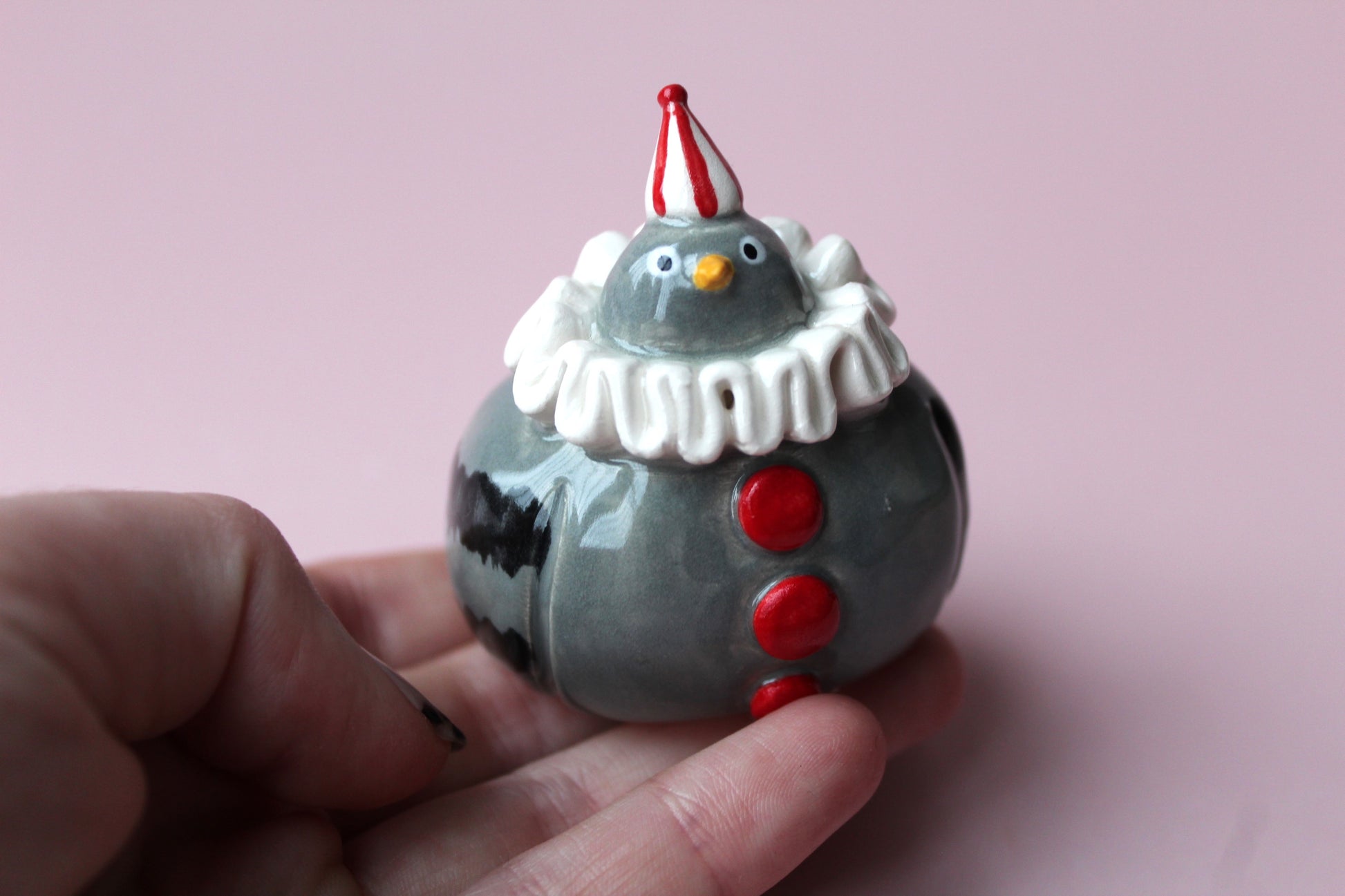 Pigeons dressed up as clowns for halloween! They wear a red and white striped party hat, ruffles round the neck and red buttons on their front.